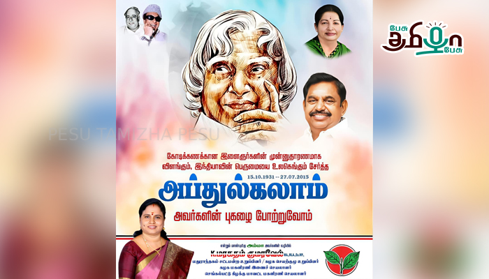 யாராகினும் கல்வியால் எந்நிலையும் மாற்றி, உயர்ந்த நிலையை அடைய முடியும் என்பதை நிரூபித்து காட்டிய கோடிக்கணக்கான இந்திய இளைஞர்களின் கனவு நாயகன், விஞ்ஞானத்தில் நாட்டின் புகழை விண்ணைத்தொட செய்த அறிவியல் ஆராய்ச்சியாளர், என்றும் மாணவர்களுக்கு ஆகச் சிறந்த வழிகாட்டியாக திகழும் நாட்டின் முன்னாள் குடியரசுத் தலைவரான டாக்டர். APJ.அப்துல்கலாம் ஐயா அவர்களின் பிறந்தநாளில் அவரின் பெரும்புகழையும், சாதனைகளையும் போற்றி வணங்குவோம்.