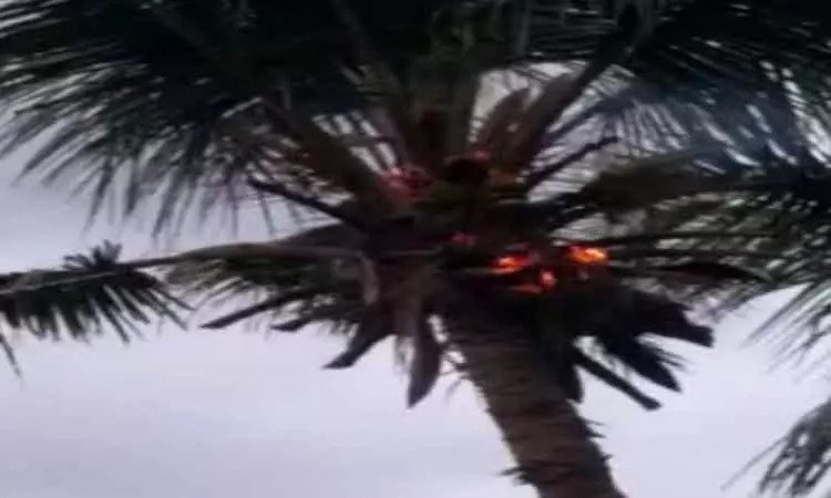 விளாத்திகுளத்தில் மின்னல் தாக்கியதில் வீட்டில் உள்ள தென்னை மரத்தில் தீப்பிடித்து எரிந்ததால் பரபரப்பு ஏற்படுத்தியுள்ளது.