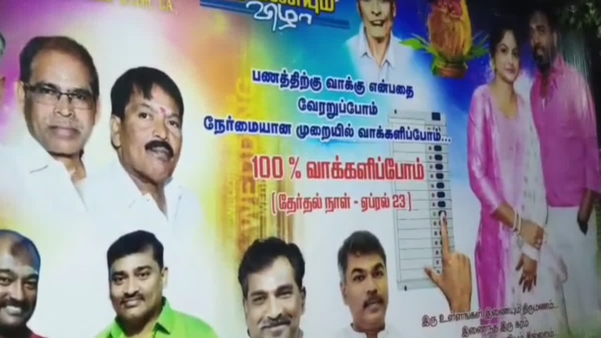 திருமண வரவேற்பில் தாம்பூலப் பை முதல் ஃபிளக்ஸ் பேனர் வரை தேர்தல் விழிப்புணர்வு ஏற்படுத்திய மணமக்களின் முயற்சி பொதுமக்கள் மத்தியில் பாராட்டை பெற்றது.