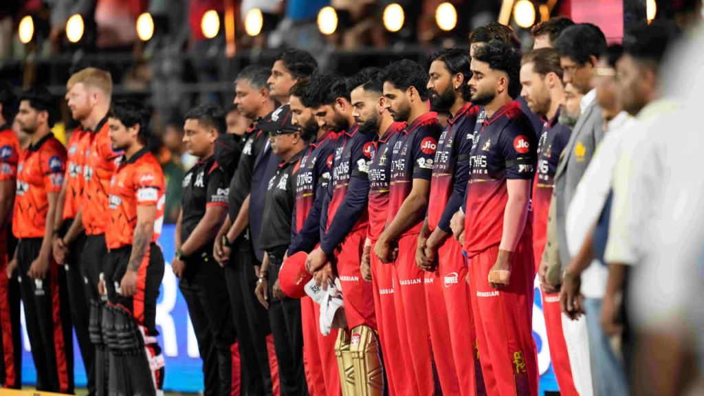 அதன்பின் கேப்டன் இஷான் கிஷன் மற்றும் நிதிஷ் குமார் ரேட்டி இணை விளையாடி வருகின்றனர். இந்நிலையில், போட்டி தொடங்குவதற்கு முன்னதாக, மைதானத்தில் ஒரு நெகிழ்ச்சியான நிகழ்வு நடைபெற்றது. அதன்படி, கடந்தாண்டு ஆர்சிபி வெற்றி கொண்டாட்டத்தின் கூட்ட நெரிசலில் சிக்கி எதிர்பாராத விதமாக உயிரிழந்த 11 பேரின் நினைவாக மைதானத்தில் இருந்த அனைவரும் எழுந்து நின்று ஒரு நிமிடம் மவுன அஞ்சலி செலுத்தினர்.