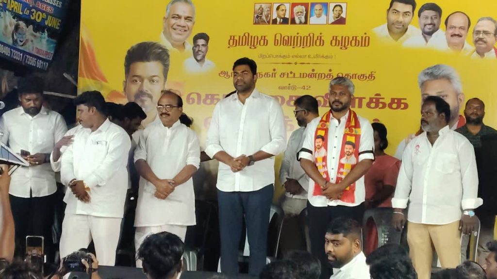 தமிழ்நாட்டில் சட்டமன்றத் தேர்தல் விறுவிறுவென நடைபெற்று வரும் சூழலில், ஆர்.கே.நகர் தொகுதியில் தேர்தல் அலுவலகத்தை தமிழக வெற்றிக் கழகம் (தவெக) தொடங்கியுள்ளது. அக்கட்சியின் தேர்தல் பிரச்சார மேலாண்மை பொது செயலாளர் ஆதவ் அர்ஜூனா அலுவலகத்தை திறந்து வைத்தார்.