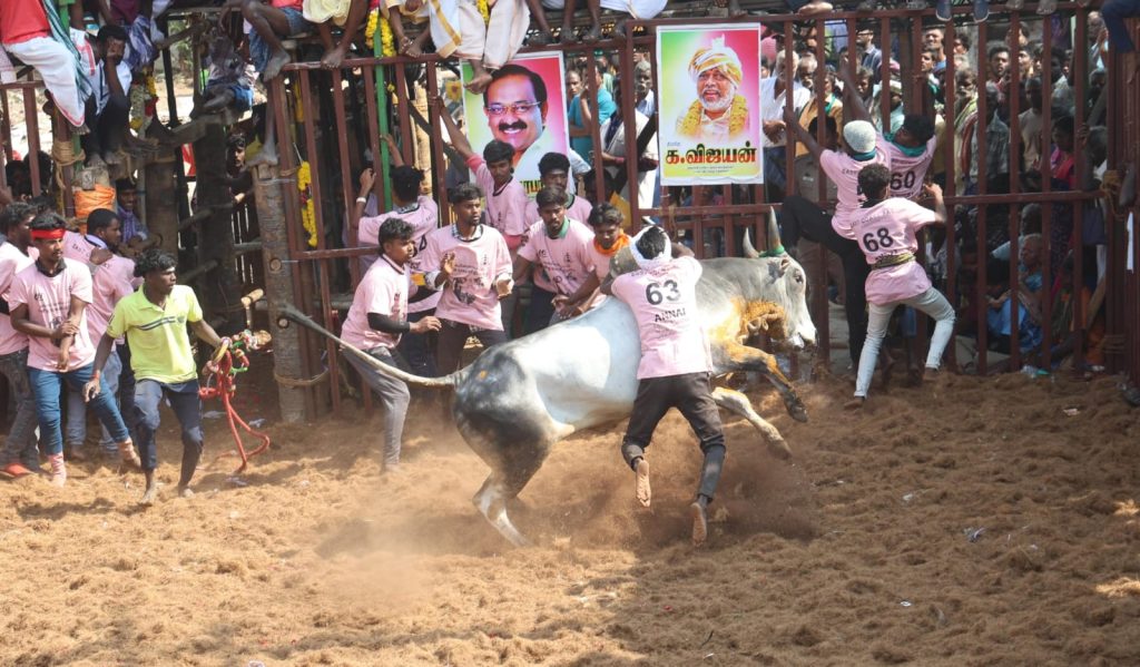 திண்டுக்கல் மாவட்டம் புகையிலைப்பட்டி புனித சந்தியாகப்பர் கோயில் திருவிழா, கடந்த வாரம் கொடியேற்றத்துடன் தொடங்கியது. இந்த திருவிழாவின் முக்கிய நிகழ்வான ஜல்லிக்கட்டு போட்டி காலையில் தொடங்கியது. அதில், திண்டுக்கல், திருச்சி, புதுக்கோட்டை, மதுரை, சிவகங்கை, அலங்காநல்லூர் உள்ளிட்ட பகுதிகளிலிருந்து 831 காளைகளும், 333 மாடுபிடி வீரர்களும் பங்கேற்றனர்.